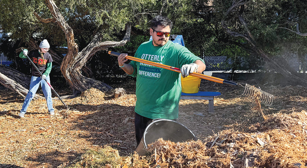College Corps members Sergio Morales (right) and Katherine-Ann Johanson help mulch the garden at Seaside’s Community Partnership for Youth headquarters during service day activities on Martin Luther King Jr. Day. (Mark Muckenfuss)
